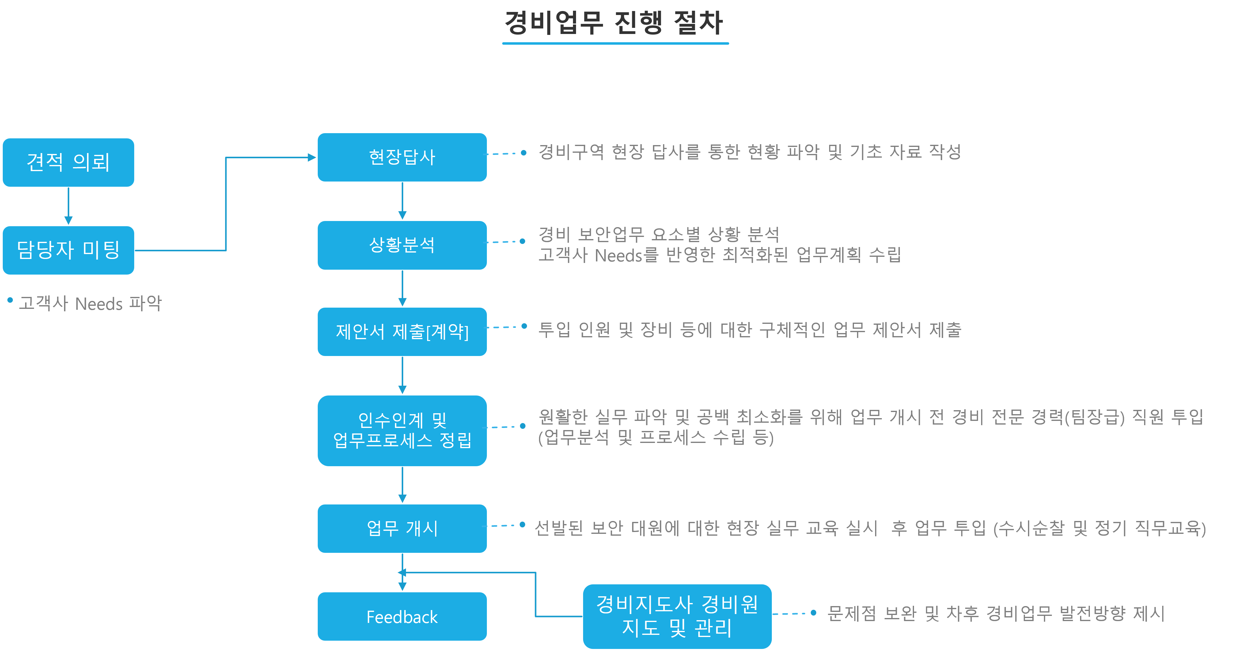 #견적의뢰 #담당자미팅 #고객Needs파악 #현장답사 #상황분석 #최적화된업무계획수립 #제안서제출 #경비도급업무계약 #인수인계및업무프로세스정립 #업무개시 #피드백 #feedback #경비지도사경비원지도및관리